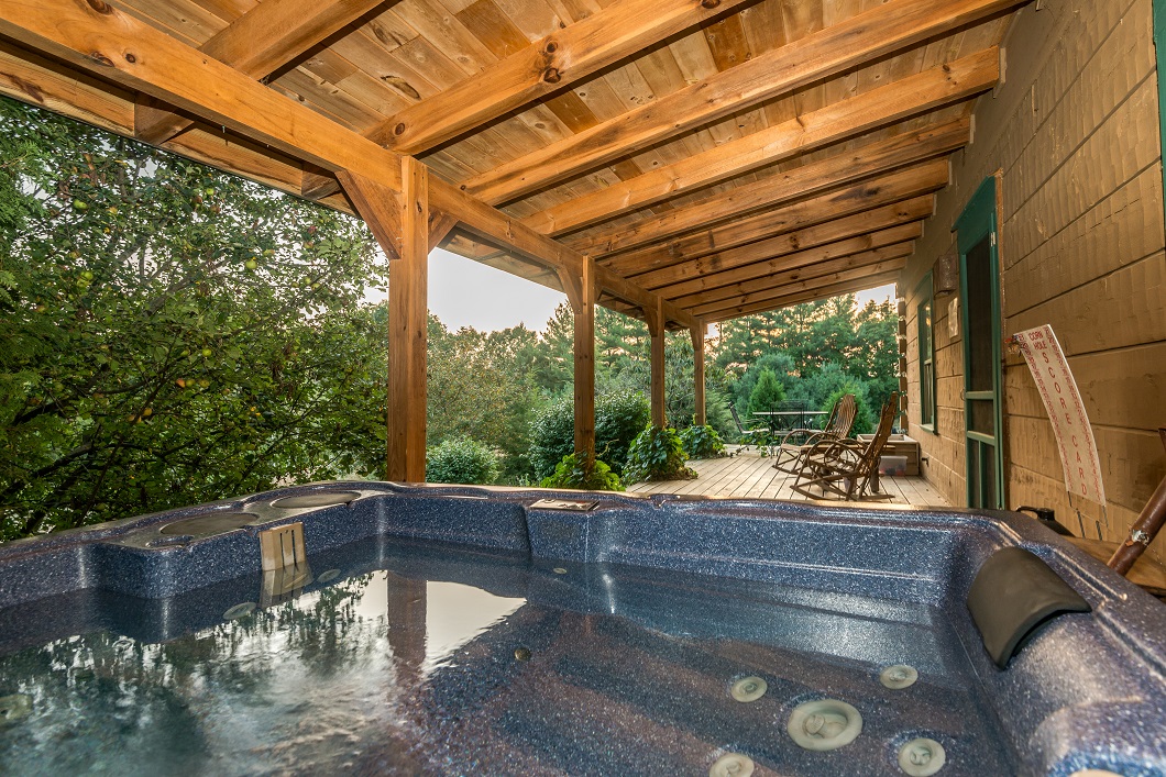 This cabin has an outdoor hot tub and an outdoor charcoal grill.