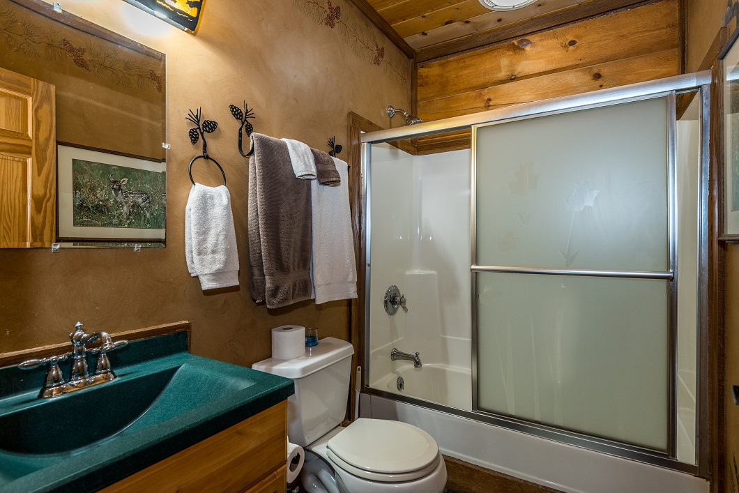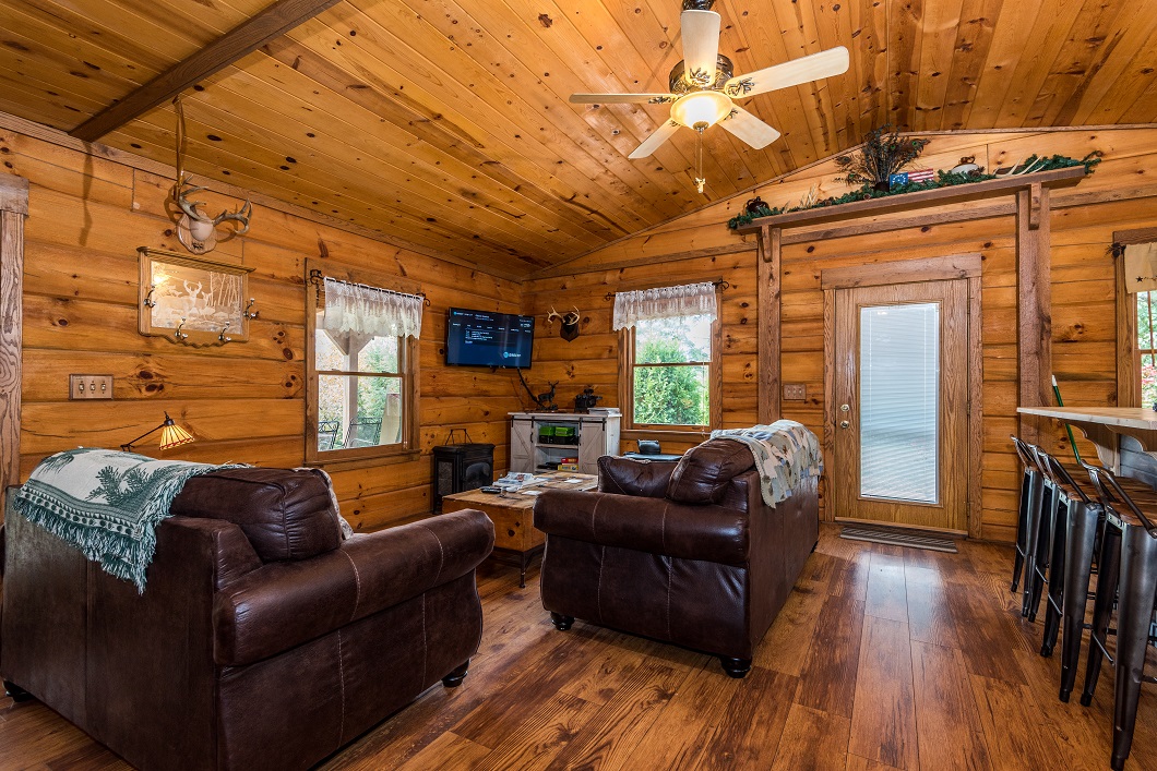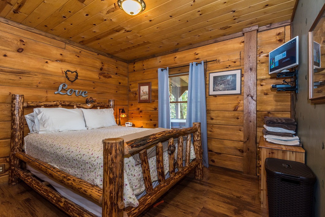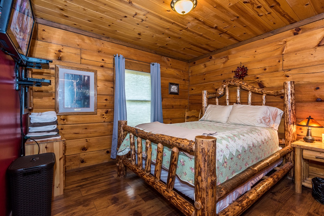 Big Buck cabin comfortably sleeps 4 people within its two bedrooms and the comfy lodge-pole pine queen beds, all decked out in cozy colorful quilts. There is one full bath. One of the bedrooms has satellite TV and one has a smart TV with Roku only.