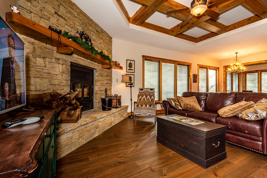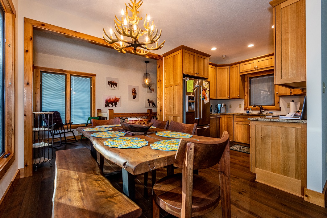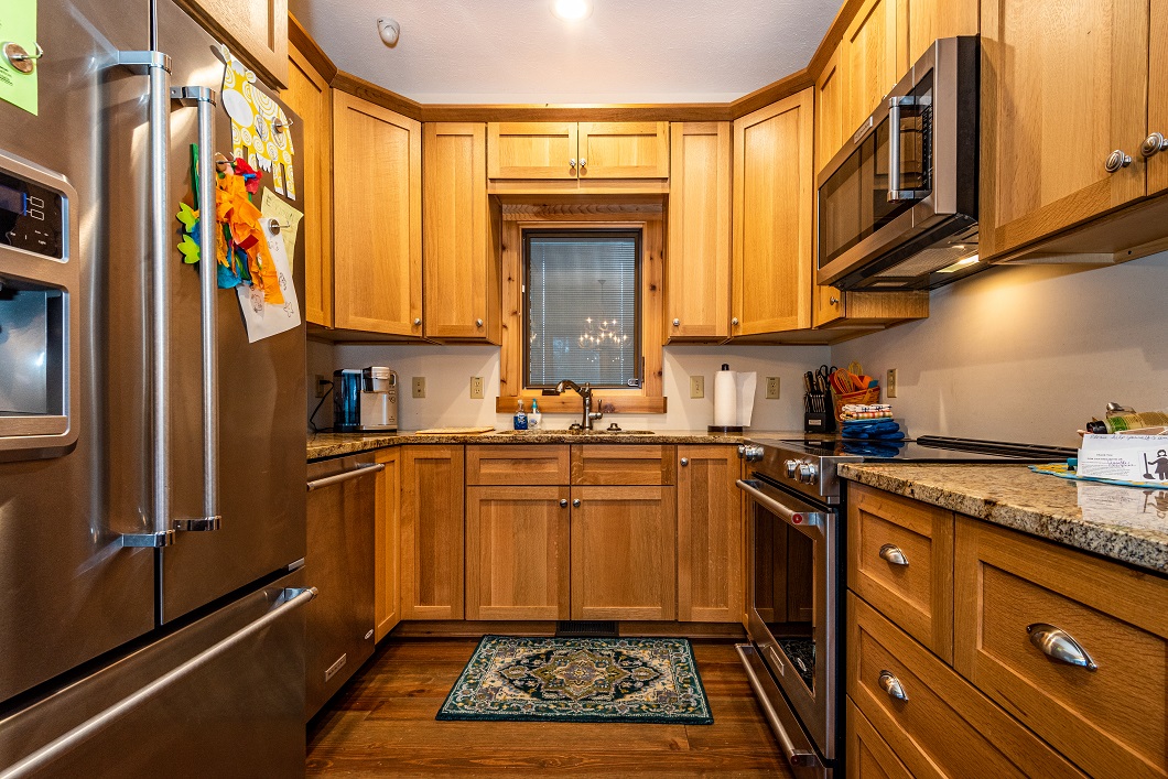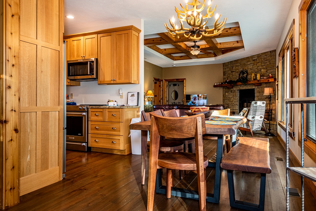 The open-concept living room/dining room/kitchen is spacious, yet cozy for a group of 2 to 4 guests. Chilly autumn and winter days will be made lots more fun if you build a fire in the wood-burning stove, and snuggle in the comfy chairs or sofa. If you’re here when the weather is warm and sunny, then you’re going to love sitting out on the porch. You can access the outdoors from the main living area on the main floor, so open up the door and let the fresh air fun commence!