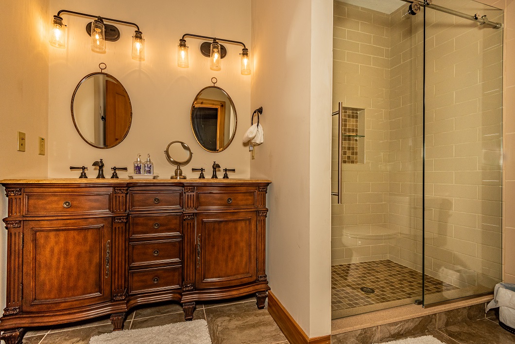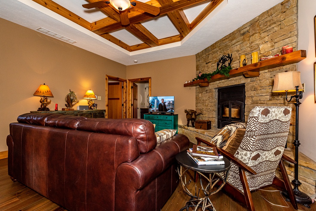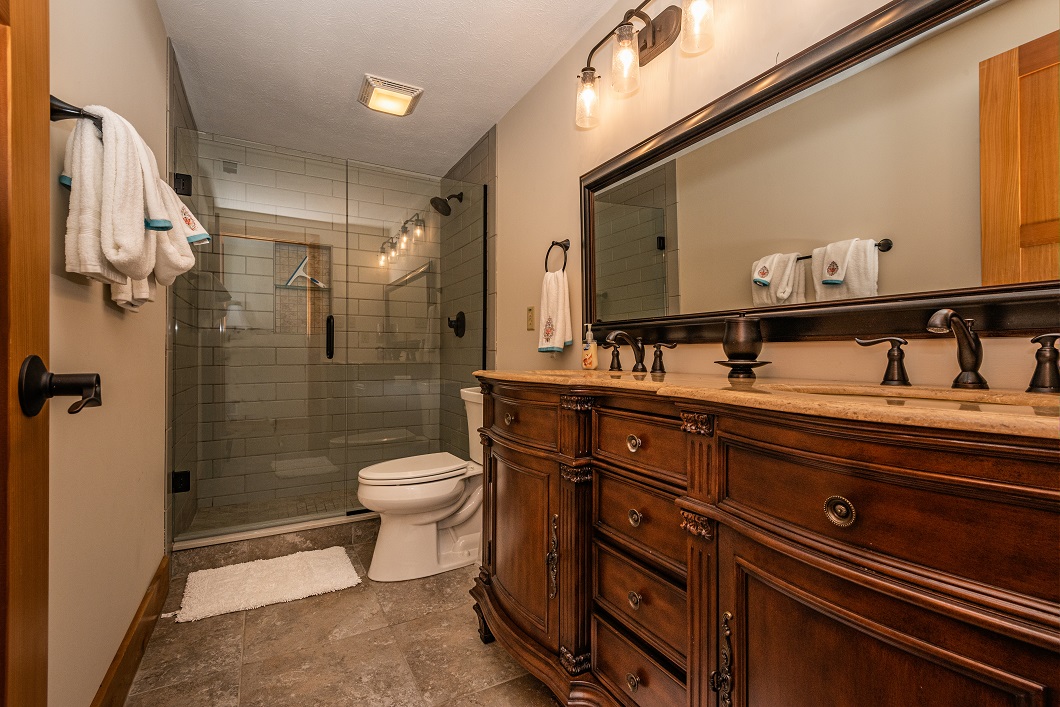 When bedtime rolls around, it’ll be just a short walk to jump into your jammmies and crawl into bed. The master bedroom features a comfy queen bed, a dresser, and a TV. The second bedroom is downstairs outfitted with a queen bed… great for the kiddos or another couple you may have invited to come along. No waiting for the shower though, as both bedrooms have their own private adjoining bathrooms.