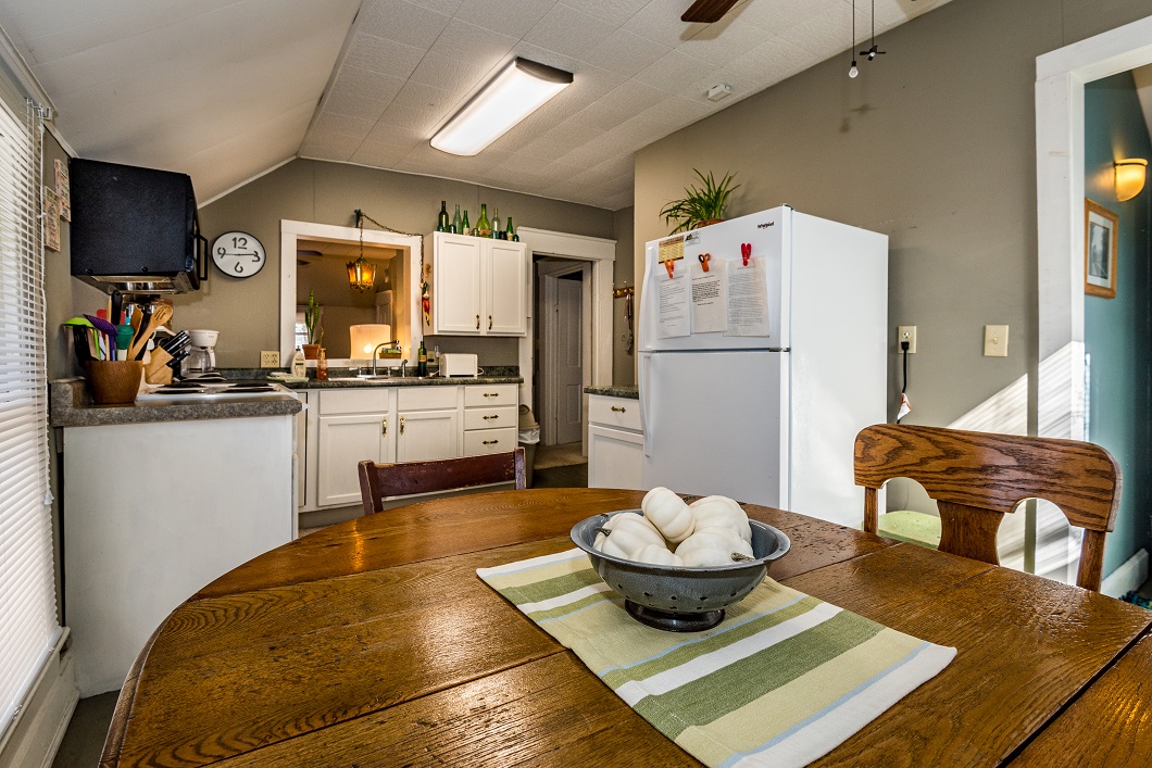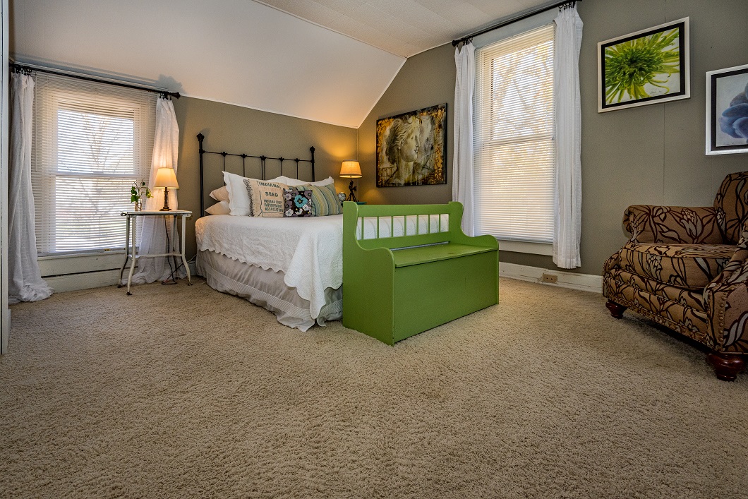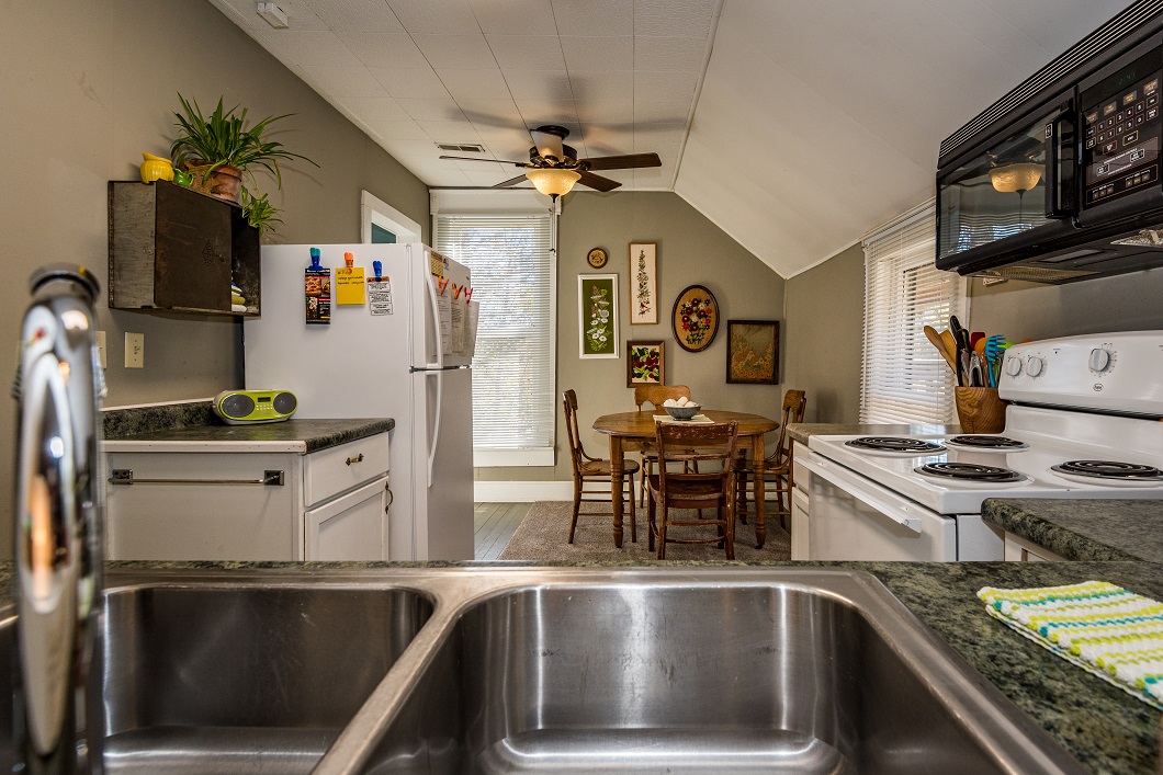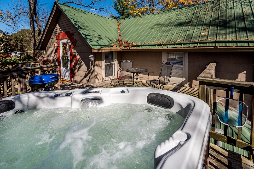 Climb the stairs to find a nice deck with a hot tub overlooking Brown County’s famous tree-covered hills (with a gorgeous view of the sunset sky), and table & chairs perfect for bird watching while you sip your morning coffee. From the deck you’ll be able to see the Indiana Railroad train, as it goes through the little village of Helmsburg. When you step inside the front door, an airy and open space that’s bright, comfortable, and clean awaits. All the rooms are spacious and decorated with vintage and up-cycled finds, as well as local art. Two cute sofas, a 40-inch flat screen TV, and a chair make for the perfect spot to snuggle, read, or watch a movie. High-speed internet, Roku, and the full Sling package provide endless options for TV watching. There are also books, games, a DVD player, a Wii video game console, and stereo for the times you may want to hunker down and stay in, cuddled up with lots of soft, cozy blankets.