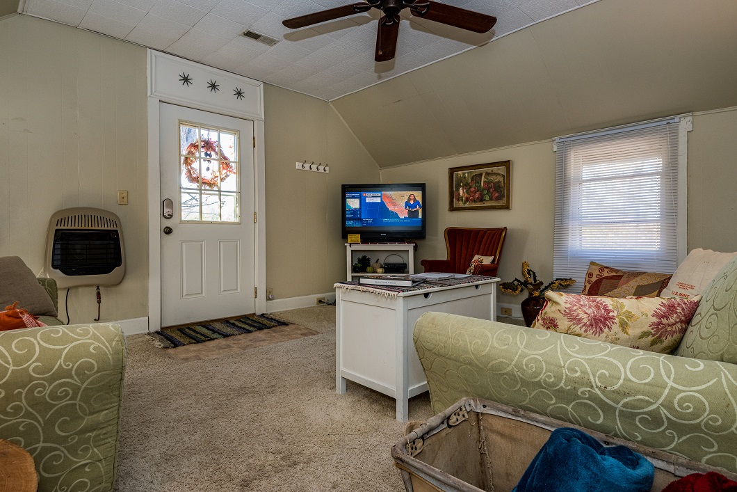 The kitchen is completely furnished, right down to the forks…so bring along the food you want to cook and you’ll be set. Cookware, colorful dishes, a toaster, blender, coffee maker, electric range, full-size fridge, and microwave are all there to make your mealtimes easy. You’ll even find flour, sugar, spices, tea, and fresh, locally roasted coffee from Brown County Coffee. Adjoining the kitchen is the laundry room with a stacking HE washer/dryer. An iron and mini-size ironing board are also provided, if you are personally offended by wrinkles.
