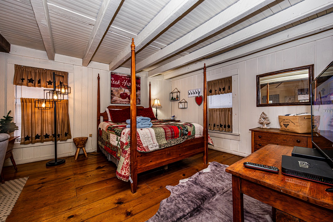 Loaded with warmth and charm, this is a great honeymoon and/or anniversary cabin. Inside you will find a king size bed in the loft, as well as a queen size bed and bathroom downstairs. There is an electric fireplace in the living area, and a cozy, well equipped kitchen, which allows for intimate dining inside or on the back deck.