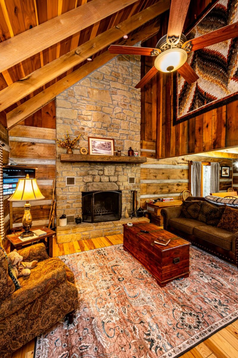 Warm, inviting, and thoughtfully designed, the cabin comfortably sleeps up to six guests with three bedrooms and three full bathrooms. The open-concept living area is perfect for gathering, featuring comfortable seating, a wood-burning limestone fireplace, and a Roku Smart TV for cozy evenings indoors. The fully equipped kitchen is a highlight, with granite countertops, modern appliances, and multiple coffee options—including Keurig, drip, French press, and pour-over—so everyone can start the day just right.