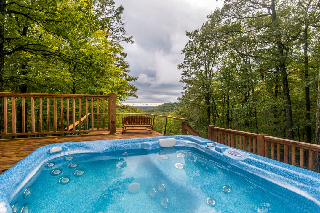 On a clear day you can see the tower at the south entrance of the Brown County State Park which is about five miles as the crow flies. In the fall, as you take a relaxing dip in the hot tub, you have one of the best private vistas to be enjoyed in this part of the world. A well-marked mile-long trail past the tree house, around the blue gill stocked pond and down to the confluence of the streams connects on the top of the west side of the property to the Yellowwood trail system which then leads back up to the path in the front of the cabin.